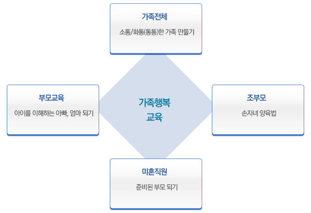 ÇູÇÑ ÀÏÅÍ¿¡¼ ÁøÇàµÇ´Â °¡Á·Çູ±³À° ÇÁ·Î±×·¥Àº Á÷¿øÀÇ »ý¾Ö Áֱ⠺° ¸ÂÃã ÇÁ·Î±×·¥À¸·Î °áÈ¥ Àü, ÁÁÀº ºÎ¸ð°¡ µÇ±â À§ÇÑ Áغñ´Ü°èºÎÅÍ ÇູÇÑ ÀÚ³à¾çÀ°À» À§ÇÑ ºÎ¸ð-ÀÚ³à °ü°è ±³À°, ÀºÅðÈÄ ¼ÕÀÚ³à ¾çÀ°À» À§ÇÑ ½Ã´Ï¾î ±³À°, ¸¶Áö¸·À¸·Î °¡Á· ±¸¼º¿ø ¸ðµÎ°¡ Âü¿©ÇÒ ¼ö ÀÖ´Â °¡Á·±³À° µîÀ¸·Î ±¸¼ºµÇ¾î ÀÖ½À´Ï´Ù.