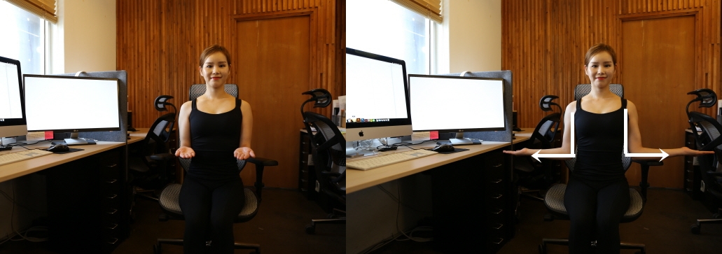 1)바르게 앉은 상태에서 두 발바닥을 바닥에 붙이고, 2) 몸통 옆에 팔꿈치를 붙여준다. 양 팔꿈치롤 90도로 접고 손 바닥이 천장을 향한다. 3) 손바닥 수평을 유지하며 손을 뒤로 보낸다.